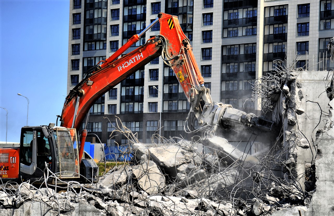 Sortierung der Bauabfälle, Zerkleinerung von Beton und Ziegel, Abtransport nicht verwertbarer Materialien, Geländeregulierung.